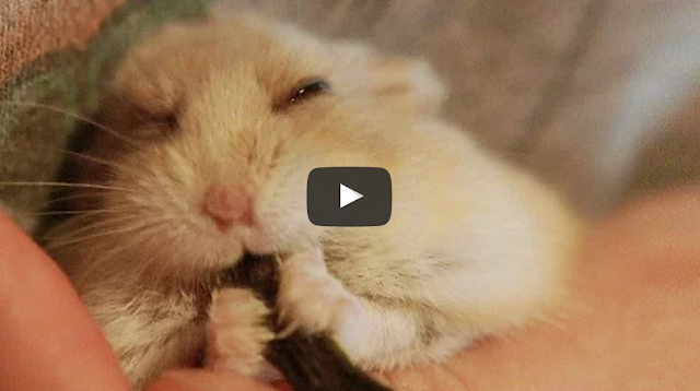 Hamster Falls Asleep While Eating a Treat by Tastefully Offensive While in the process of munching on a snack, Dumptruck, the hamster, begins to drift off to sleep in the hand of her owner, April Campbell. Previously: Hamsters Compete on Tiny Agility Course [AprilsAnimals]