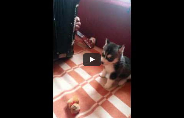 This tiny husky puppy tries his best to sing along (makes cute puppy noises) while his new human performs a song on his accordion.