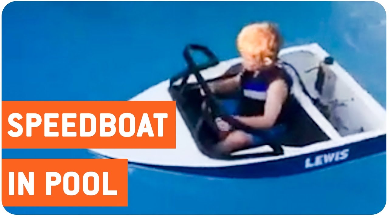 Kid Cruises Around Swimming Pool in Mini Speedboat