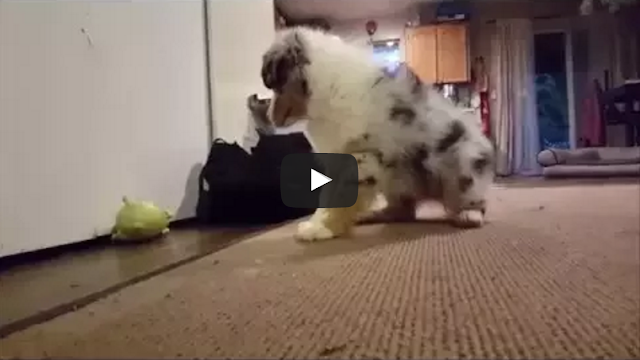 Harvest, the fluffy Australian shepherd puppy, keeps himself (and his human) endlessly entertained by relentlessly attacking his squeaky toy pig.