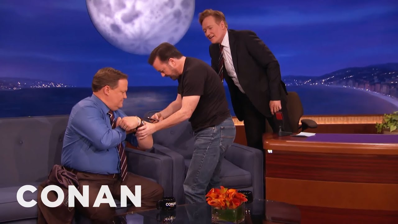 In this new clip Conan clip, British comedic actor and upcoming host of the Golden Globes, Ricky Gervais, shows host Conan O’Brien, and Conan’s sidekick, Andy Richter, how to play a game he came up with after realizing he could make his arm look like butt cheeks.