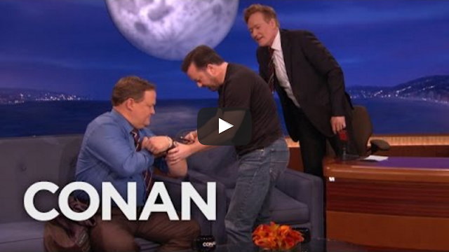 In this new clip Conan clip, British comedic actor and upcoming host of the Golden Globes, Ricky Gervais, shows host Conan O’Brien, and Conan’s sidekick, Andy Richter, how to play a game he came up with after realizing he could make his arm look like butt cheeks.