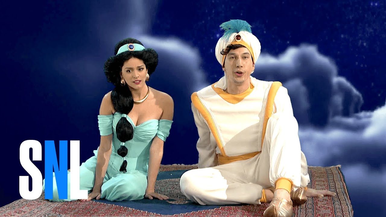 In this spoof of Disney’s Aladdin, Princess Jasmine (Cecily Strong) and Aladdin (Adam Driver) run fly into some unexpected issues during their magic carpet ride.