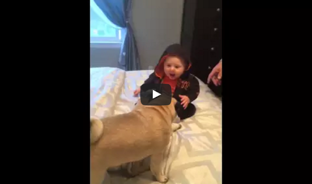 8-month-old Kennedy giggles hysterically when her pug siblings, Bailey and Barnum, try to get her to play with them.