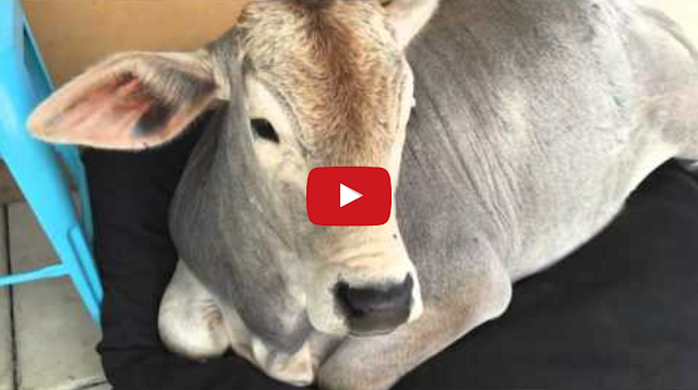 Karen White‘s 11-month-old cow, named Radar, who’s basically a dog trapped in a cow’s body, settles down for a nap on a dog bed that he outgrew quite a while ago.