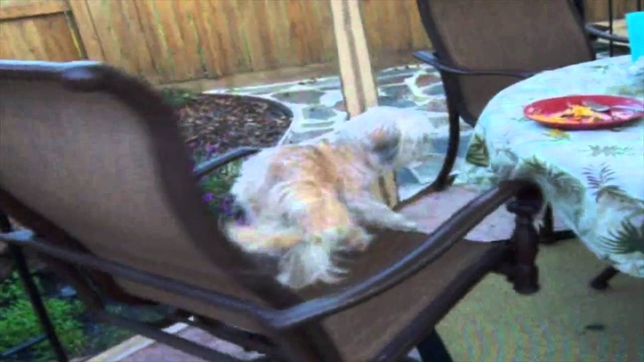 This hungry dog gets trapped in a spinning vortex when an outdoor chair prevents him from stealing a bite of his human’s lunch. Some say he’s still spinning…