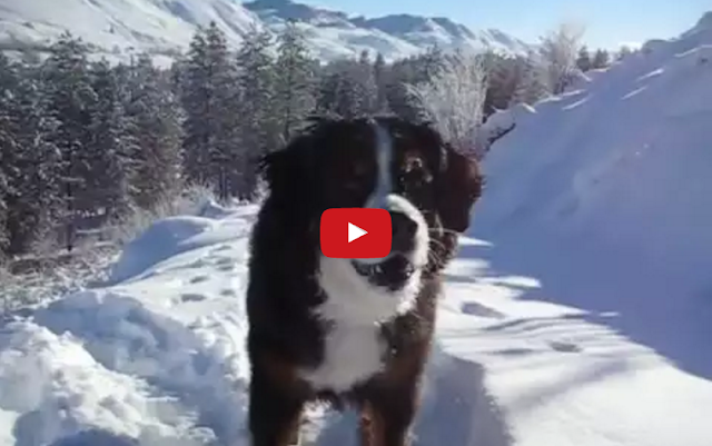 Little Miss Sunshine, the Bernese mountain dog, enthusiastically helps his human, Brian Drye, sled down a snow-covered hill in Winthrop, Washington.