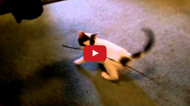 While playing with a branch, this clumsy kitten quickly spins around in circles until he makes himself too dizzy to walk straight.
