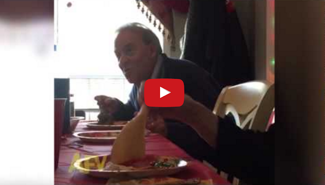 During a family dinner, a prankster son tricks his elderly mother into taking a bite of a turkey leg-shaped squeaky dog toy.