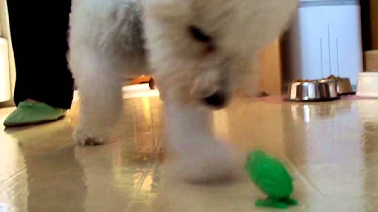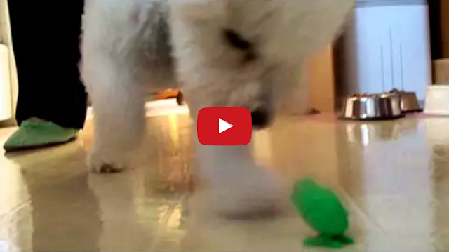 A hopping wind-up frog toy appears to momentarily hypnotize this fluffy little dog, causing him to frantically dig at the toy in a trance-like state.
