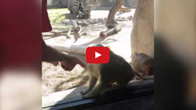 A man visiting a local zoo receives jaw-dropping reactions when he performs a disappearing and reappearing card trick for a curious baboon.