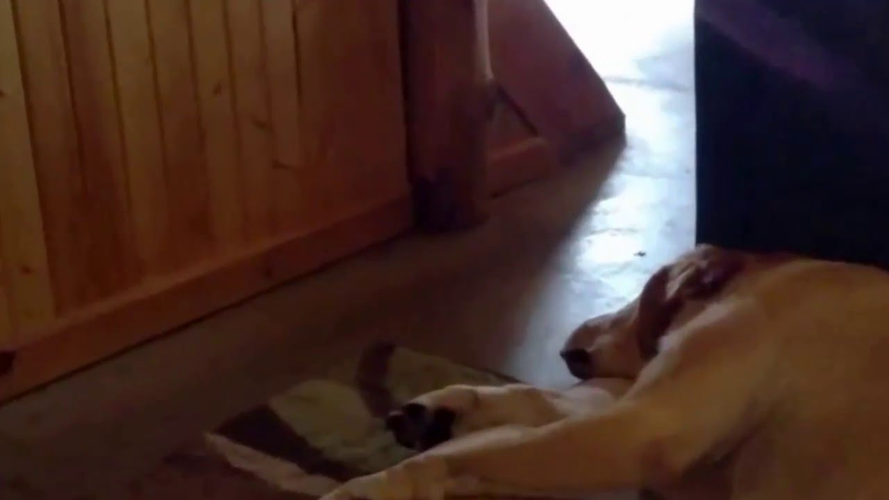 While enjoying an afternoon nap, this labrador retriever dog was caught doing a pretty spot-on impression of Donald (or Daffy) Duck snoring.