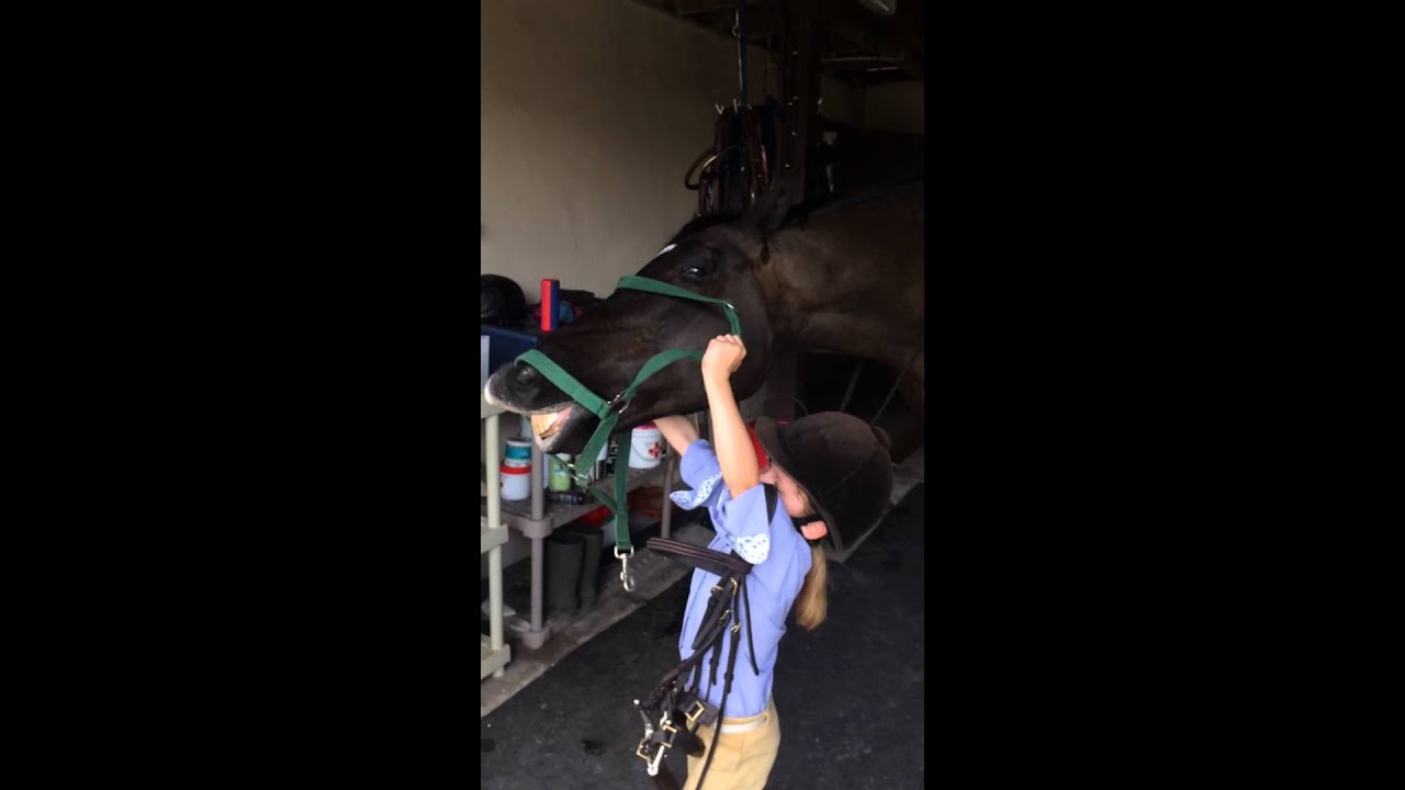 This five-year-old girl gets inadvertently lifted into the air when she’s attempts to put a bridle onto her horse, Regalo.