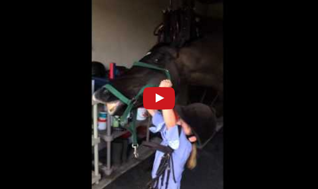 This five-year-old girl gets inadvertently lifted into the air when she’s attempts to put a bridle onto her horse, Regalo.