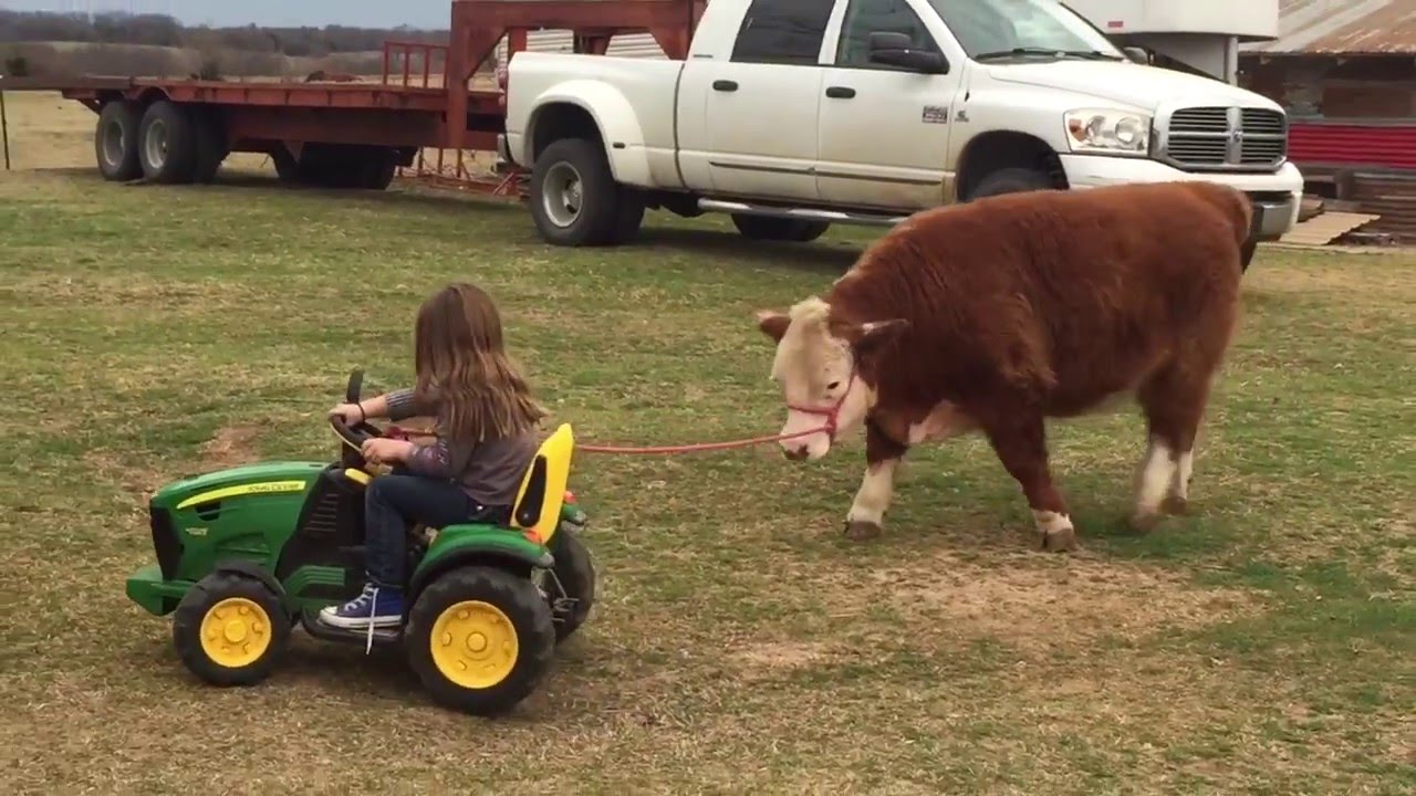 This cute little girl from Oklahoma gives her chubby pet miniature Hereford steer some exercise by leading him around with her John Deere Power Wheels tractor.