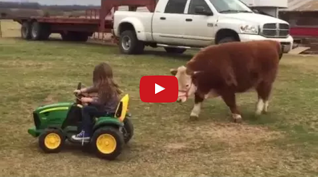 This cute little girl from Oklahoma gives her chubby pet miniature Hereford steer some exercise by leading him around with her John Deere Power Wheels tractor.