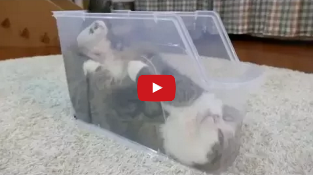 Maru, the box-obsessed celebrity cat from Japan, struggles to squeeze his not-so-slim body into a slim plastic storage contaniner.