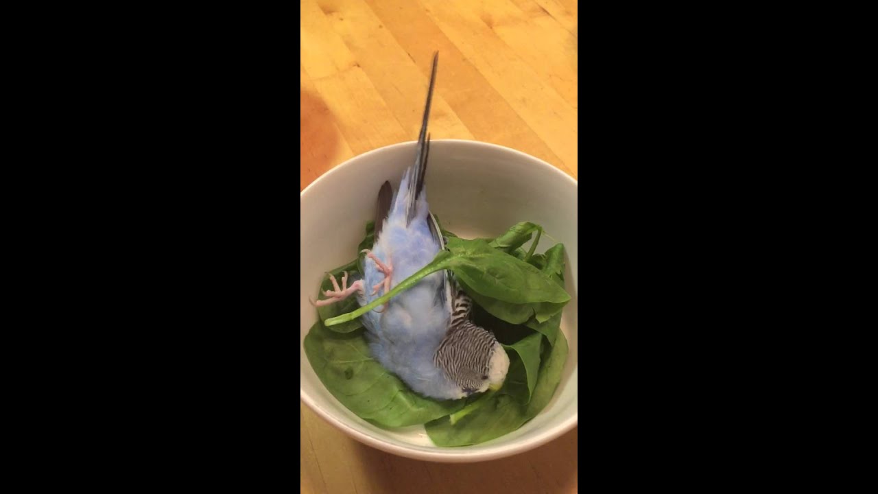 Peru the parakeet’s peculiar way of eating spinach involves excitedly rolling around in it (like a cat with catnip) while munching on the stems and leaves.