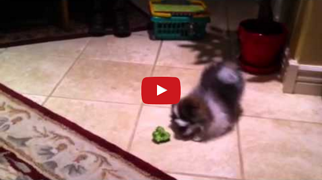 Rocky, the 7-week-old Pomeranian puppy, unexpectedly goes into attack mode when he sees a floret of broccoli for the first time. According to his human, Rocky acts normally around other vegetables, and only gets angry at broccoli.