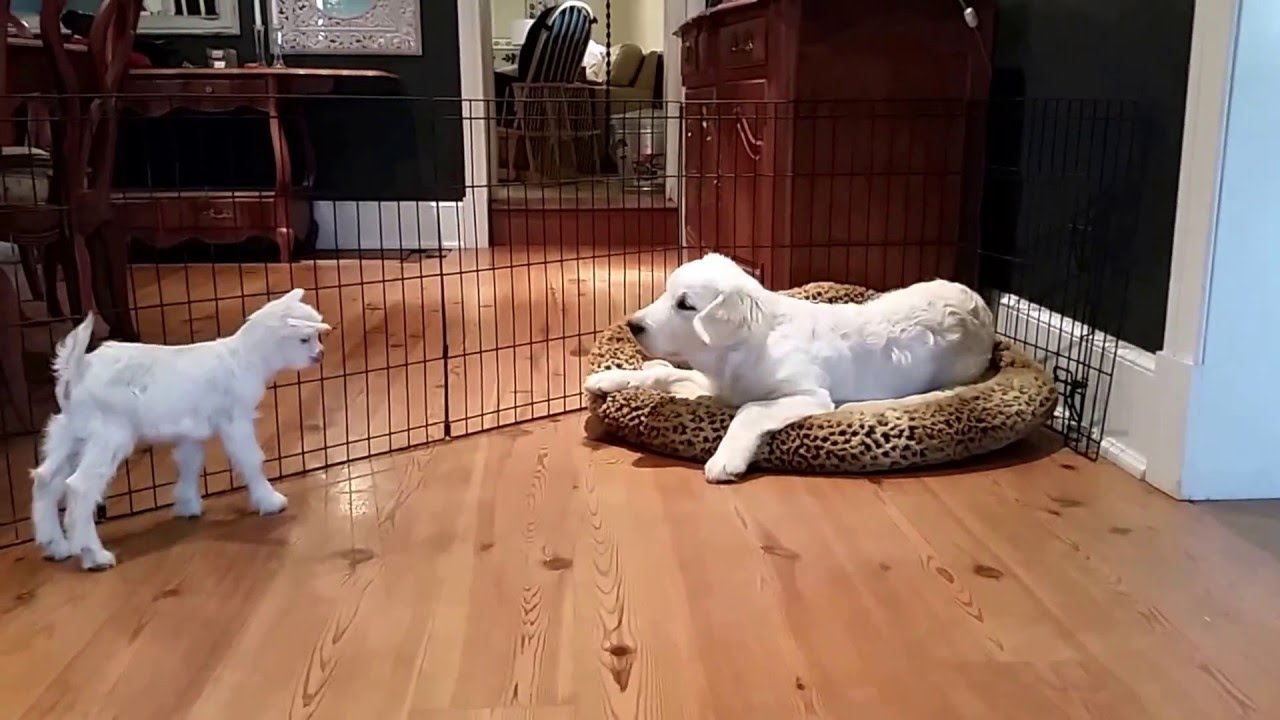 A rambunctious four-month-old golden retriever puppy desperately wants his new four-day-old baby goat housemate to roughhouse with him.
