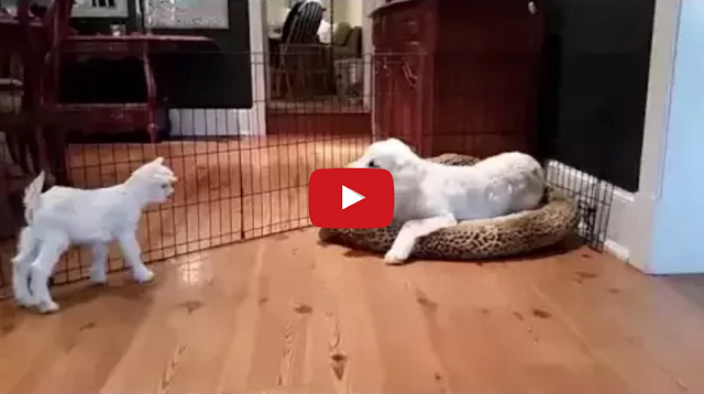 Puppy Really Wants to Play with Baby Goat by Tastefully Offensive A rambunctious four-month-old golden retriever puppy desperately wants his new four-day-old baby goat housemate to roughhouse with him. [Sean cadden/via Natsdorf]