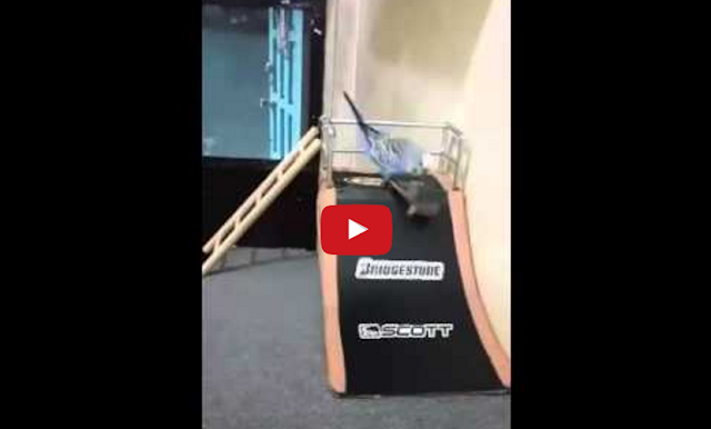 Matthan Casauay‘s talented parakeet rides a mini skateboard down a mini skateboard ramp, while Avril Lavigne’s “Sk8er Boi” appropriately plays in the background.