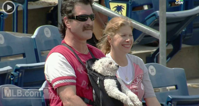 During yesterday’s Philadelphia Phillies/Houston Astros spring training game, a furry little Phillies’ fan was spotted in the stands chilling in a baby carrier while watching the game with his humans.