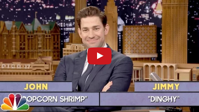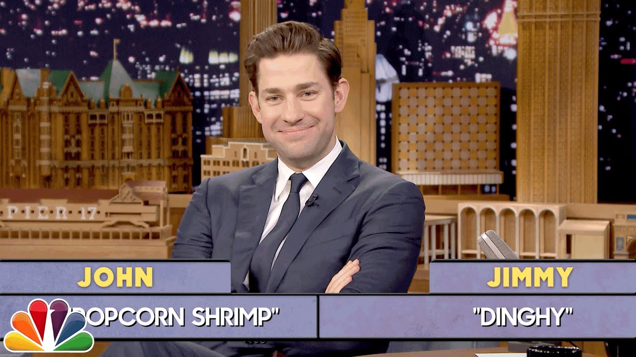 Actor John Krasinski and Tonight Show host Jimmy Fallon play “Word Sneak,” a game where players attempt to sneak random words into a casual conversation, as smoothly as possible.