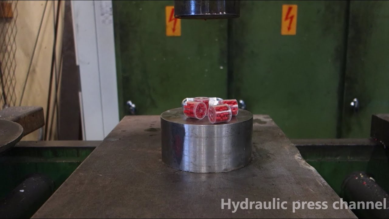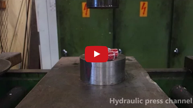 In the latest episode of his oddly entertaining YouTube series, Finnish machine shop owner, Lauri Vuohensilta, uses his hydraulic press to find out what happens when you squash small explosive objects, like cap gun ammunition, CO2 cartridges, and soda and Mentos, with 100 tons of force.