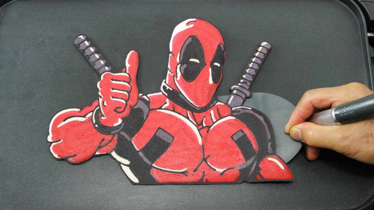 Pancake artist, TigerTomato, creates a big, detailed pancake version of Marvel Comics’ wisecracking anti-hero, Deadpool.
