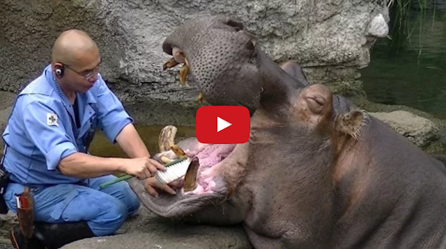 Humongous Hippo Gets a Dental Checkup by Tastefully Offensive A fearless zookeeper from the Tennoji Zoo, in Osaka, Japan, tends to the dental needs of one of the zoo’s massive hippopotamuses, then loads the patient hippo’s mouth with fruits and veggies. [Manten]