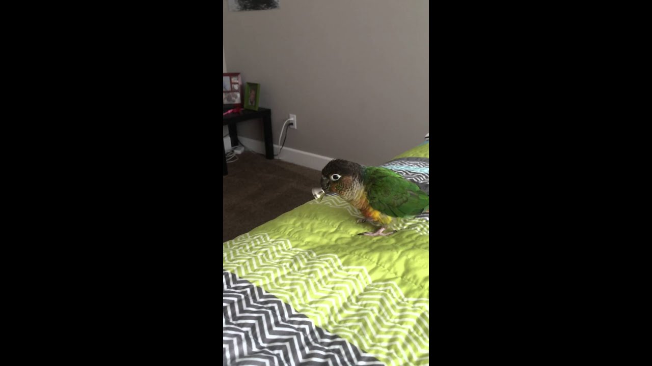 Milo, the green-cheeked conure parrot, adorably throws all of his bells and toys off the bed, except for his spiky balls, which he appears to be a little intimidated by.