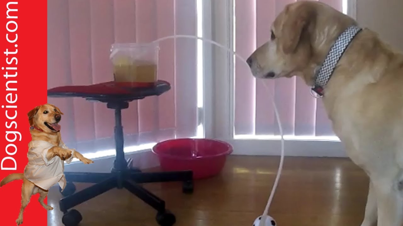 After demonstrating the Archimedes principle, Albert, the labrador retriever (aka The Dog Scientist), is back to learn and demonstrate the siphoning method to obtain more of his delicious but unreachable soup.