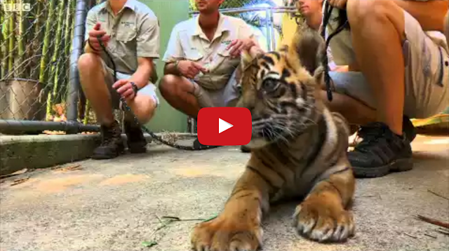 In this clip from the BBC Nature series, Tigers About the House, zookeeper Giles Clark from Australia Zoo introduces two rescued tiger cubs, Spot and Stripe, to their first grown-up tiger.