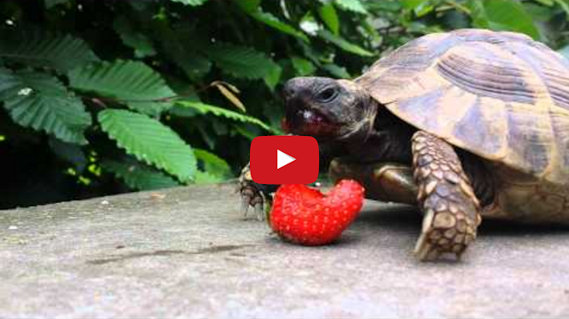 After several failed chomp attempts, Fritz, the spur-thighed tortoise, finally takes a bite out of his strawberry treat, then proceeds to sloppily devour the entire thing.