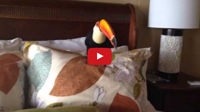 Toucan Having Fun Playing on Bed by Tastefully Offensive Paco, the pet toco toucan, keeps himself entertained by attacking and hiding behind the pillows on his human’s bed. Previously: Paco Plays in Sewing Box [ToucanLadyBVI]
