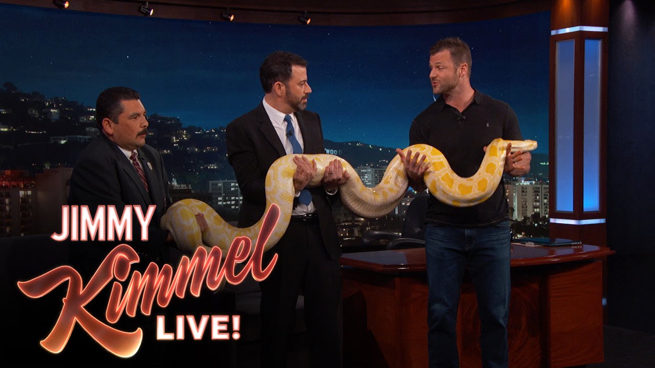 Animal expert and Animal Planet host, Dave Salmoni, returns to Jimmy Kimmel Live (previously) to make host Jimmy Kimmel uncomfortable with more exotic animals, including a lion cub, a hyacinth macaw, and a huge Burmese python.