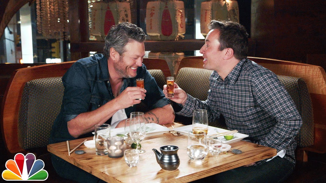 Country singer and judge on The Voice, Blake Shelton, had never tried sushi before, so Tonight Show host, Jimmy Fallon, took him to the famous Nobu sushi restaurant in New York City to broaden his food horizons (and drink lots of rice wine).