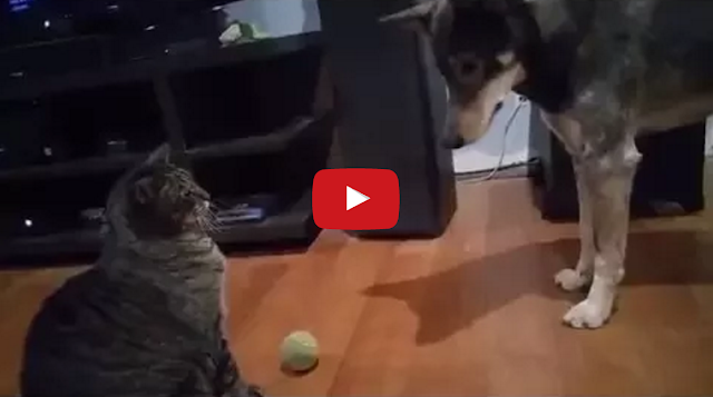 Poor Arya, the dog, gets denied access to her beloved tennis ball by her cantakerous feline housemate, Optimus.