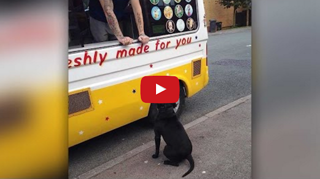 Excited Dog Receives Treat From the Ice Cream Man by Tastefully Offensive Reggie, the three-year-old Staffordshire bull terrier, patiently waits in line for ice cream when the ice cream man pays a visit to his neighborhood. [Caters]