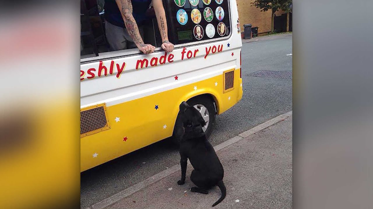 Reggie, the three-year-old Staffordshire bull terrier, patiently waits in line for ice cream when the ice cream man pays a visit to his neighborhood.
