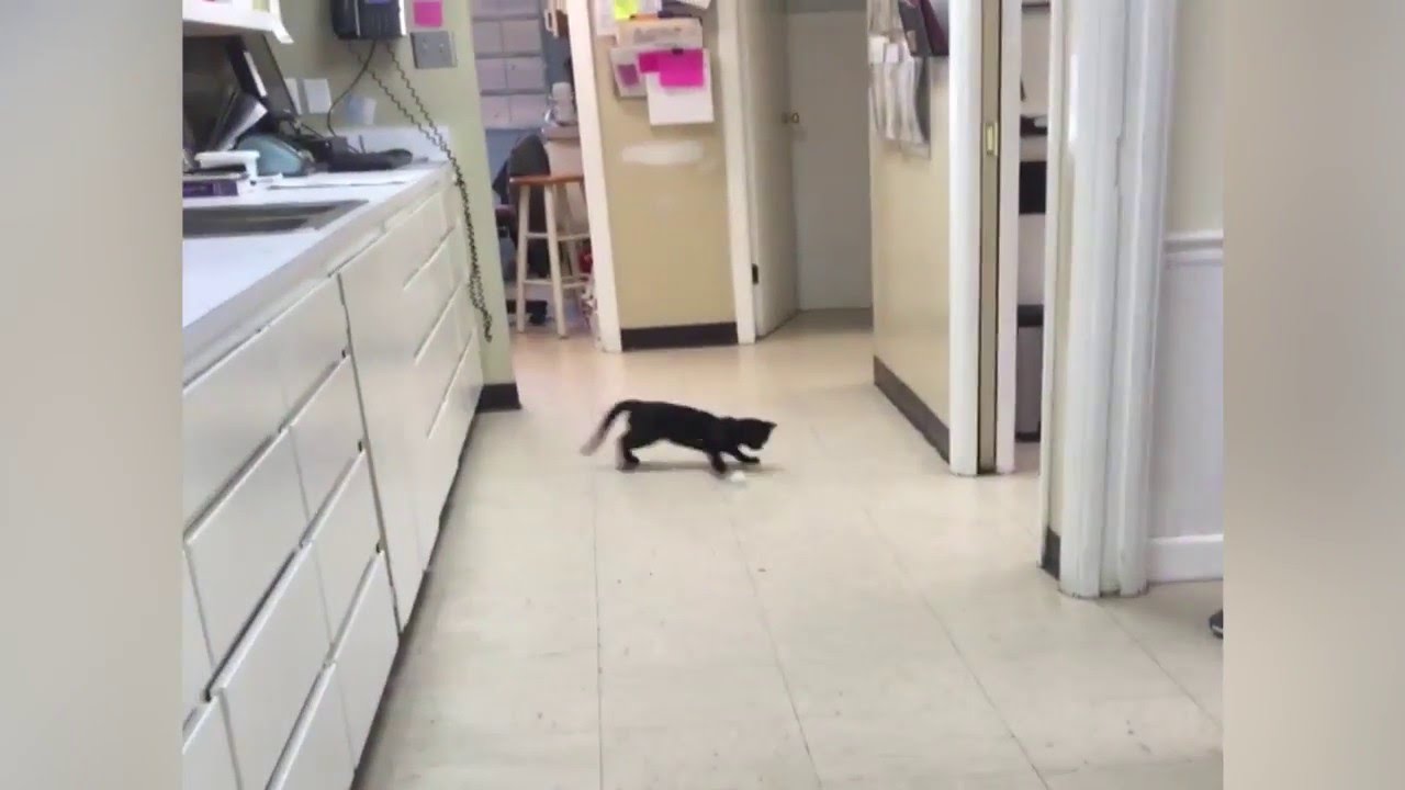 In this short but cute clip, a rambunctious black kitten copies the bounces of a ping pong ball while chasing it down a hallway.