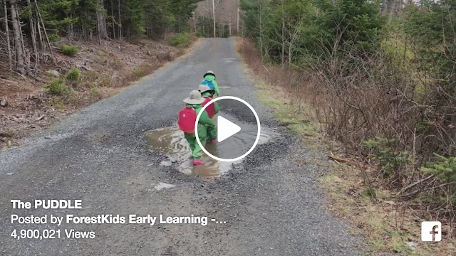 This group of cute kindergarteners (who look a lot like baby Teenage Mutant Ninja Turtles) have a blast playing in a big puddle together while on their way to the ForestKids Early Learning Center in Hammonds Plains, Nova Scotia, Canada.