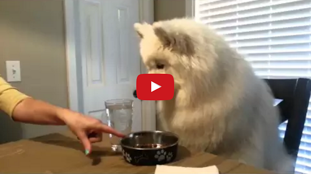 Lexi, the fluffy Samoyed dog, politely enjoys her kibbles and bits while dining at the dinner table with her humans.