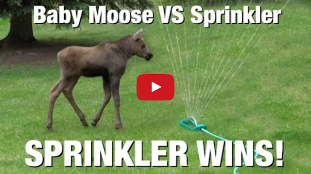Cory and Kristen Williams, a YouTube vlogging couple living in Alaska, filmed this adorable baby moose having fun with (and going crazy over) a spinkler in their front yard.