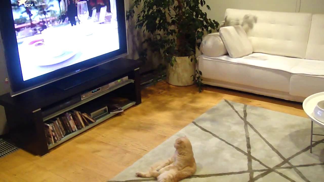 YouTube user Magic Fold discovered her cute Scottish fold cat, Tisha, sitting on his bum like a little human while watching an action movie on TV.