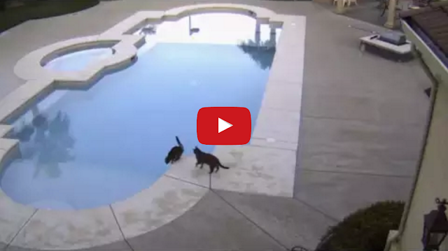 While a cat is drinking from a swimming pool, his mischievous brother sneaks up behind and swats his tail, causing the poor cat to freak out and fall into the pool.