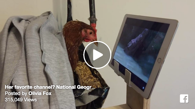 While recovering from an injury, Strawberry, the hen, avoids boredom by watching nature shows on the National Geographic Channel.