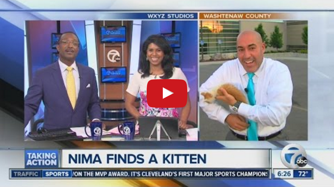 While doing a live report in Washtenaw County, Michigan yesterday morning, Nima Shaffe, a reporter for Detroit’s WXYZ 7 Action News, was greeted by a friendly stray kitten who hung around with Nima and his camera crew for the rest of the shoot.