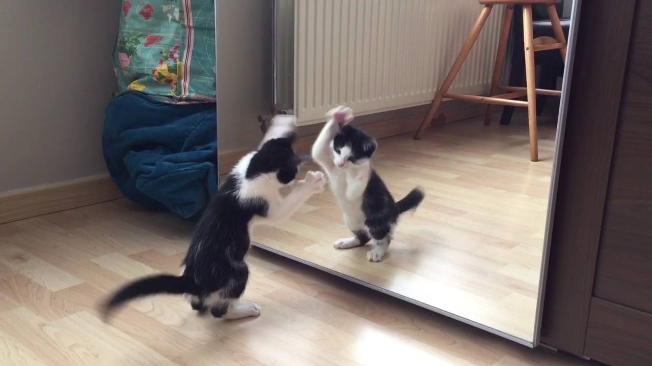 Wiske, the kitten, adorably tries to pick a fight her reflection after discovering herself in the mirror for the first time.